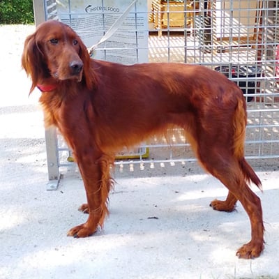 An Irish Setter is officially a hunting dog, especially for bird hunting, a so-called "pointing dog" originating in Ireland. He is of average size: 57-63 cm. height at the withers with medium length beautiful red-brown to mahogany red hair with a beautiful silky sheen. You will find this kind of description much more extensive everywhere and on Wikipedia.